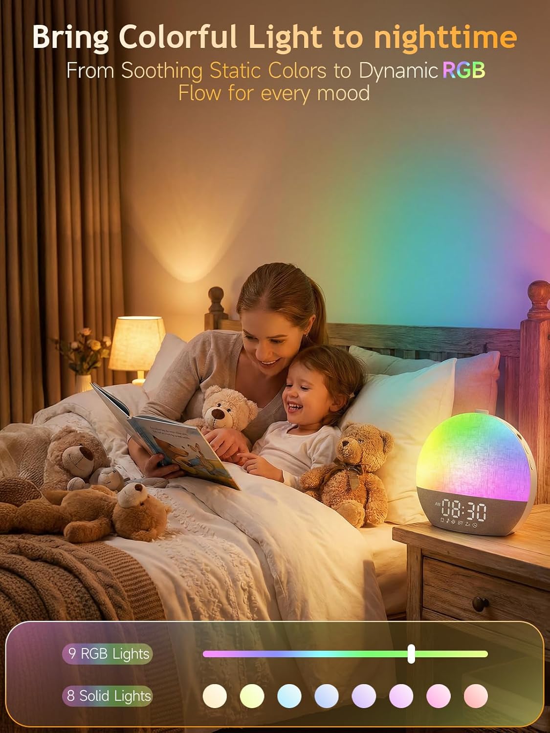 Personaliza tu dormitorio con una paleta de colores infinita. Elige entre 8 colores fijos o 9 efectos dinámicos RGB para crear desde un ambiente de lectura acogedor hasta una atmósfera de fiesta. Sus 20 niveles de brillo lo convierten en la lámpara de cabecera perfecta para cualquier situación.