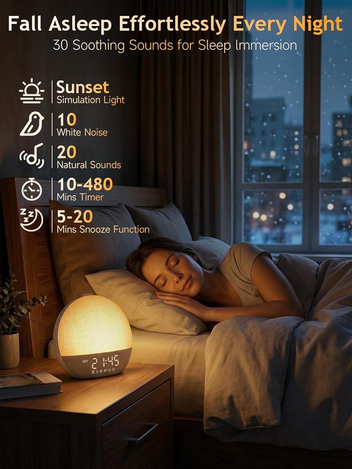 Simulación de Atardecer: Por la noche, la luz se atenúa suavemente junto con sonidos relajantes, preparando tu cuerpo para un descanso profundo y reparador.