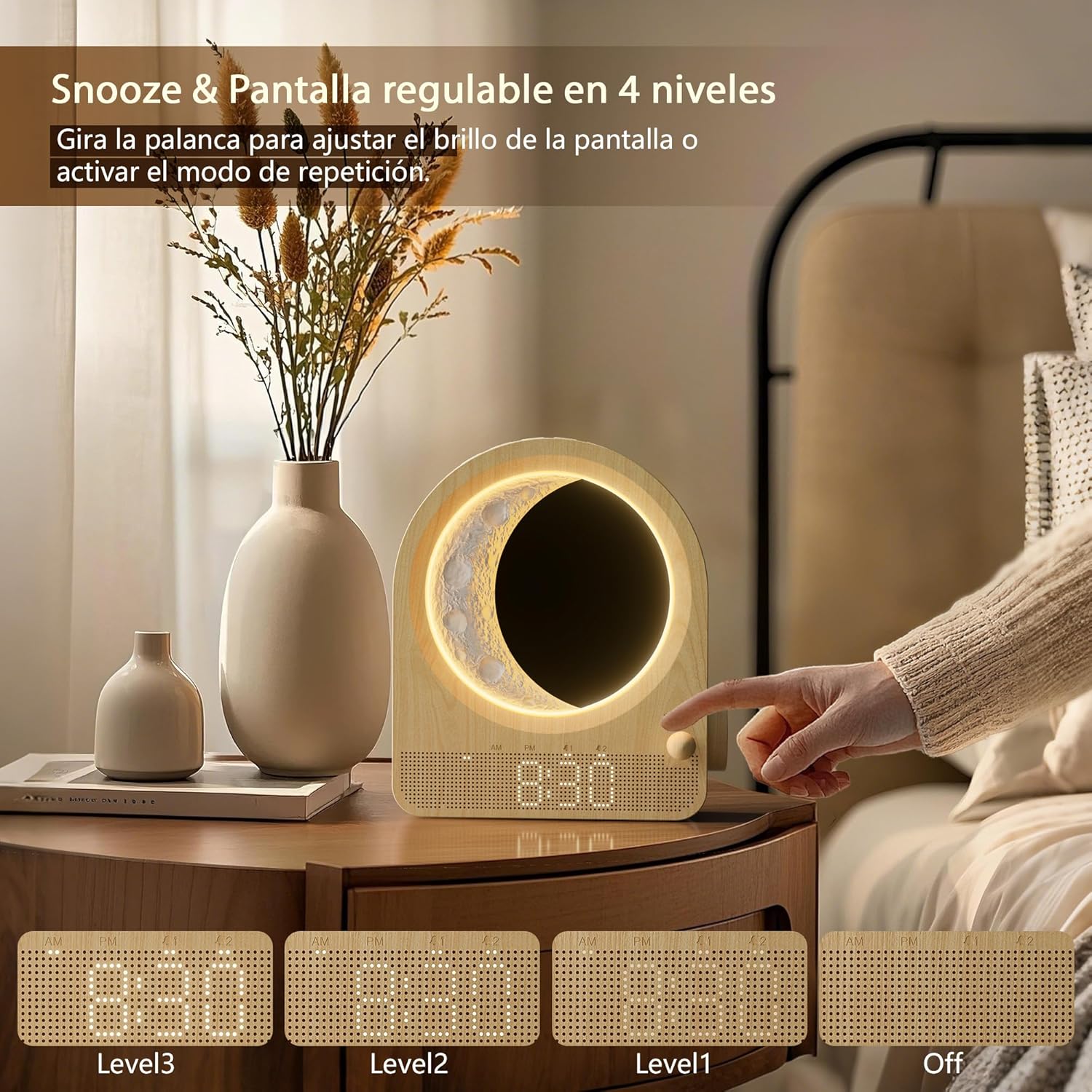 Su acabado en grano de madera se integra perfectamente en decoraciones nórdicas, rústicas o modernas. El reloj digital permite cambiar entre formato 12/24h y el brillo de la pantalla es ajustable para evitar reflejos molestos durante la noche.