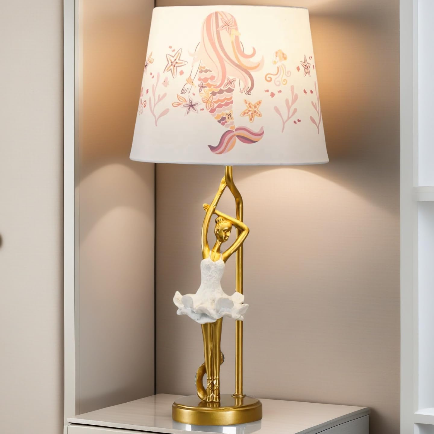 La base presenta una figura de bailarina en una pose elegante, acabada con un detalle meticuloso que resalta su silueta. La estructura combina la pureza del blanco con toques dorados estratégicos, creando una pieza de estilo "Glam" que destaca tanto encendida como apagada. Es el complemento perfecto para una mesita de noche, un tocador o un escritorio de estudio.